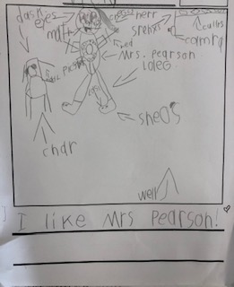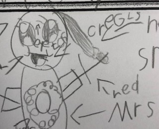 On this particular day, I got to one of my student’s desks, and I was way beyond thrilled to see that they had chosen ME to write about! YAY!! Awww….those are the moments a teacher lives for! In my “dreamy teacher floating on a cloud” state, I was so calm on the outside, but inside, there was a HUGE, silent party going on in my head as I knew I had beat out their family members and playground recess besties for this honor!! I saw she had drawn me with big bright eyes and a cute outfit. She labeled my mouth (math), my hair (herr), my desk (dask), my chair (char) and even our computer camera that we use to project onto our active board with! She gave me shoes (sheos) and a flower on my shirt that she labeled as “picster” for picture. But then something confused me a little. I saw she had given me something labeled as “cregls”. When I asked her what that was, she said as if it was obvious, “Cringles!”