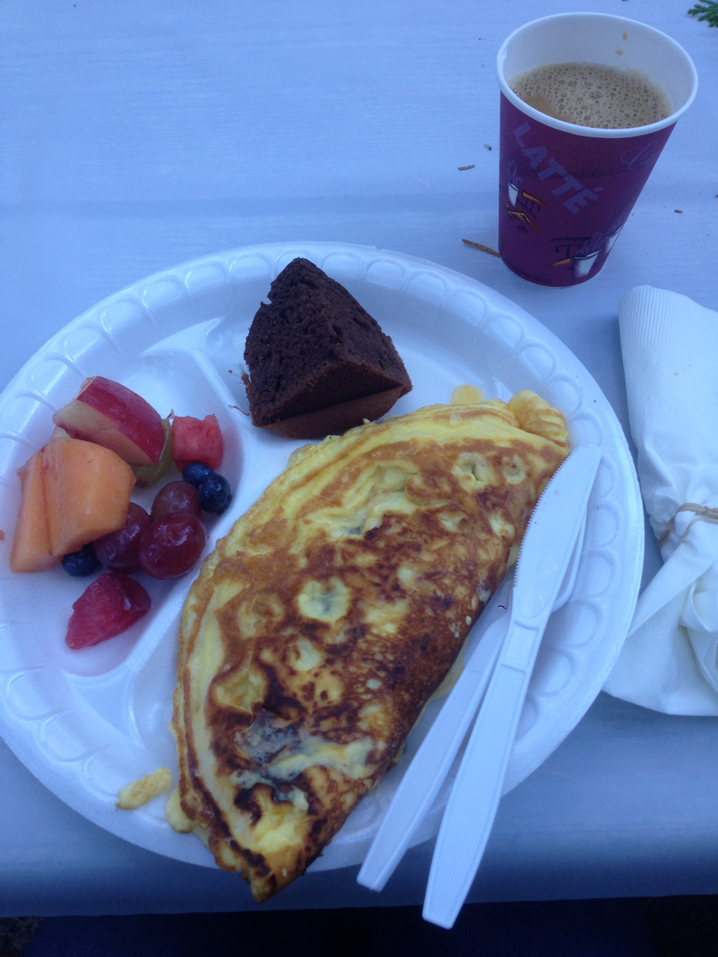 Don’t think I’m weird or anything (is it too late for that?!) but this meal is just perfect!! It’s simply this: an omelette loaded with ham, cheese, and perfectly sautéed veggies, made by the very cheery volunteer firefighters who live and work up in the beautiful mountains of Butte Meadows, California. There’s Pete’s coffee, orange juice, fruit salad cut up by adorable little old ladies, muffins, pancakes….and more…all included!! My family and I carry our incredibly heavy double-duty plates to the outdoor picnic tables underneath the towering pine trees to eat our mountain breakfast! Birds are chirping, the air is brisk, and we are bundled like little snow skiers (that’s cause we’re city folk, you know. The